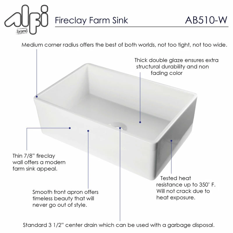 ALFI brand fireclay farm sinks are a throwback to a simpler time. Designed to offer the traditional popular look of an apron farm sink with a contemporary twist. Made of the highest quality solid fireclay to ensure it not only looks great but also lasts for a very long time.