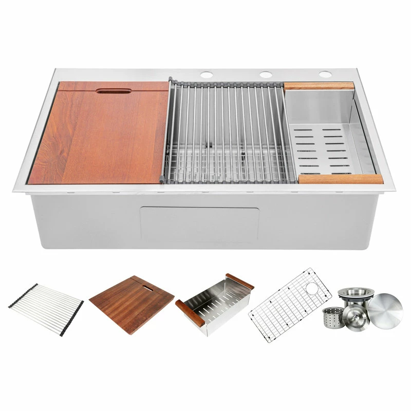 The Premium Package Includes: Stainless Steel Sink, Stainless Steel Dish Rack, Stainless Steel Colander, Cutting Board, Protective Bottom Grid, Strainer w/ Cap, mounting hardware and cutout template.