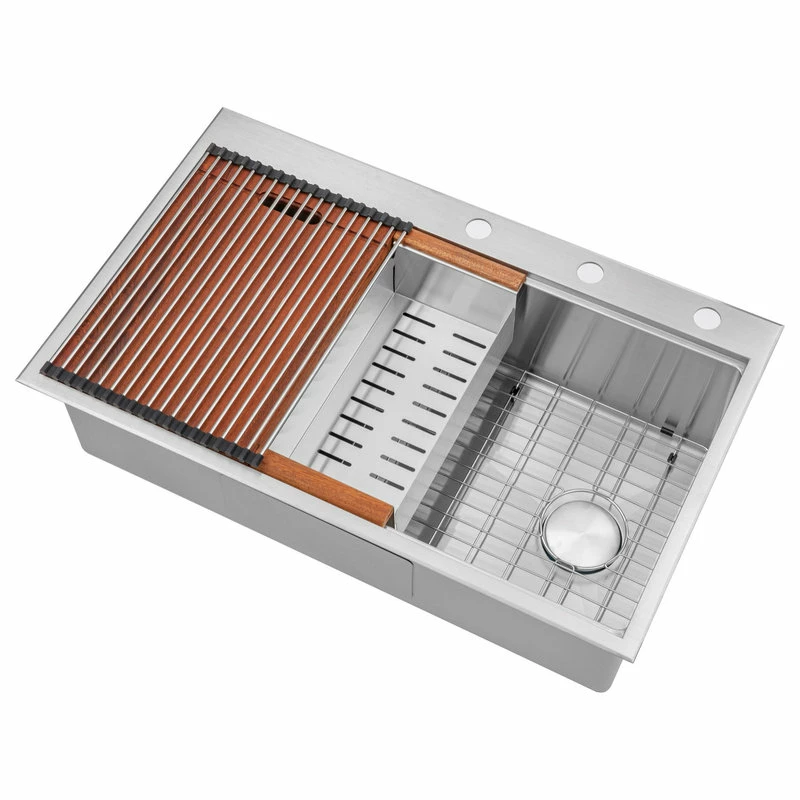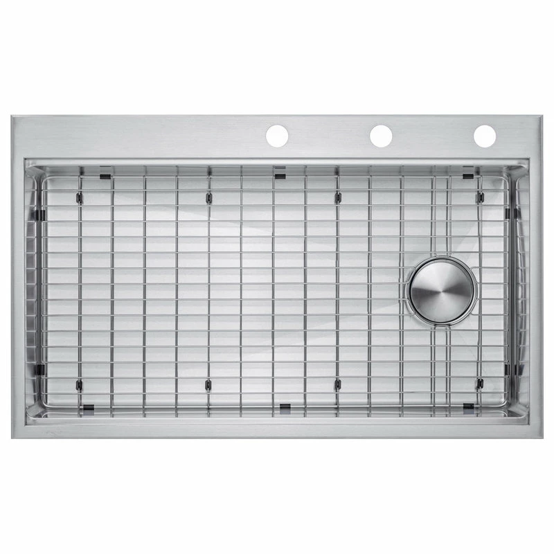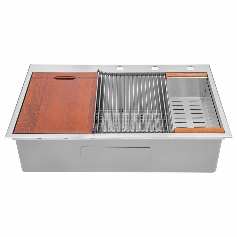 An integrated ledge supports custom accessories that slide across the sink, streamlining your kitchen workflow from meal-prep to clean-up. The sink comes with a chef’s kit that includes a stainless steel dish rack and heavy-duty cutting board that allow you to work right over the sink without taking up counter space.