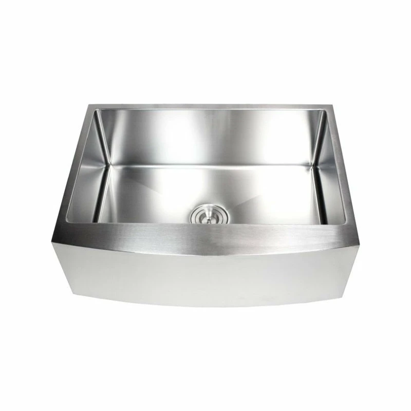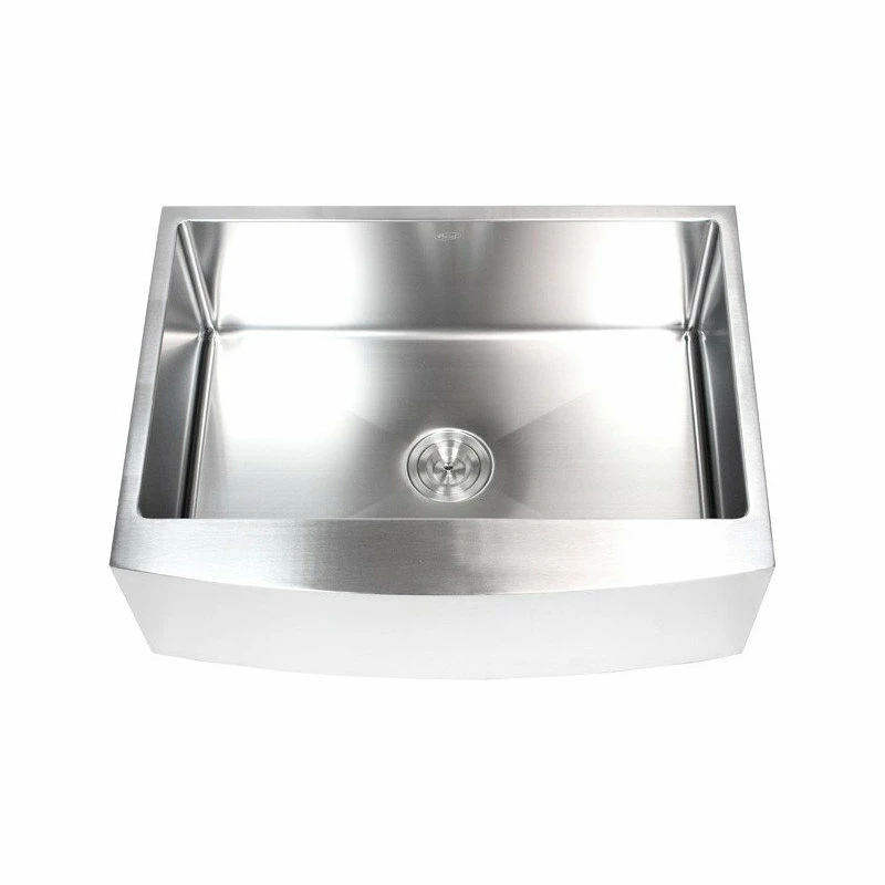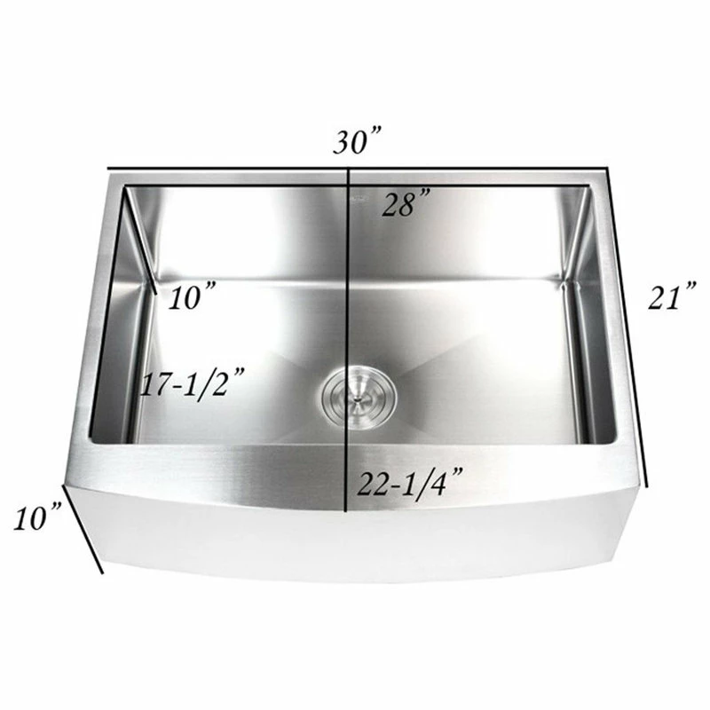 This durable farmhouse apron sink is hand crafted from 16 gauge stainless steel with a smooth curved front. Exterior Dimensions 30″ x 21″. Interior Dimensions 28″ x 17-1/2″. Apron Depth 10″. Bowl Depth 10″.