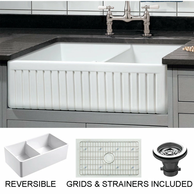 Our fine fireclay kitchen sinks are hand crafted in the old English tradition of solid casting, making them stronger than hollow casting. Using the finest raw materials and fired at 2300 degrees F for 20 hours, our fireclay sinks are made to last. They are both beautiful and extremely durable – resistant to chips, scratches and stains, with a smooth easy to clean surface. They are glazed on all 4 sides and are reversible, so you can choose from a decorative side or a smooth finish.