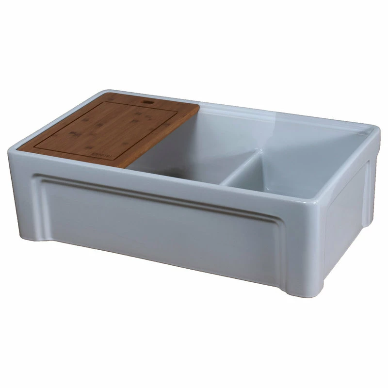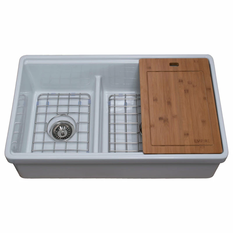 The Tosca Fireclay Farmhouse Kitchen Sink with Heavy-Duty Bottom Grid, Stainless Steel Strainer, Cutting-Board and Optional Dish Rack is a remarkable workstation. Traditional style with a modern twist that is totally unique. It features apron front installation, a popular option in kitchen renovations. Masterfully handcrafted in Italy from authentic fine fireclay, and featuring an innovatively integrated accessory ledge, the empire Tosca is durable, beautiful and versatile. The accessory ledge is built so custom accessories will fit within the sink to better utilize space and simplify food preparation. The sliding cutting board and drying dish rack offer incredible practicality and ease of use.