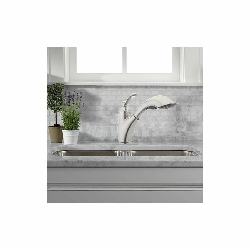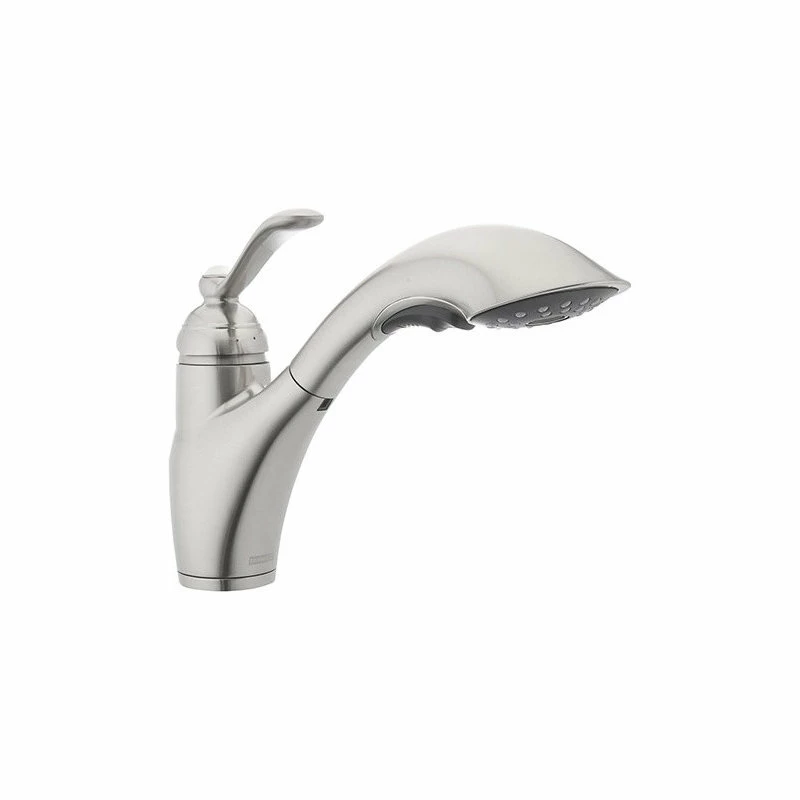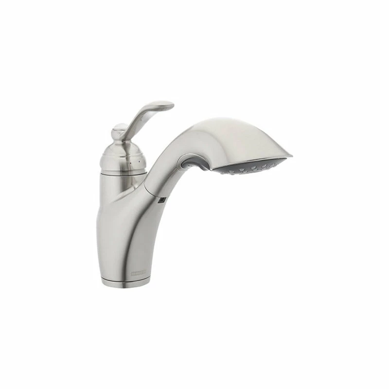 The Franke USA 115.0287.056 Single Handle Pull Out Kitchen Faucet will define any decor you match it to with elegance and simple charm. This faucet is all about being stylish without sacrificing practicality. The matching pull out spout lets you direct the water where you need it and makes pot filling a breeze! With it’s timeless satin nickel finish, this product’s color will be sure to stand out among your decor. Full installation kit includes all hardware needed to install. Hoses are NOT Inlcuded . Low lead compliant.Features:Satin NickelSingle Lever HandleLow Arc with Pull Out SprayerOne Hole InstallationLow Lead Compliant