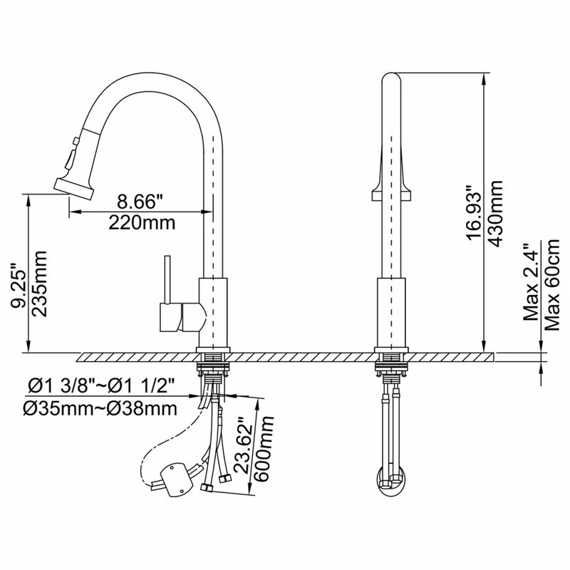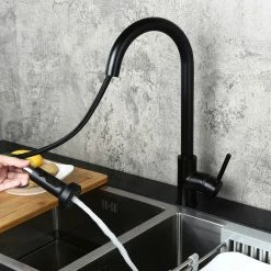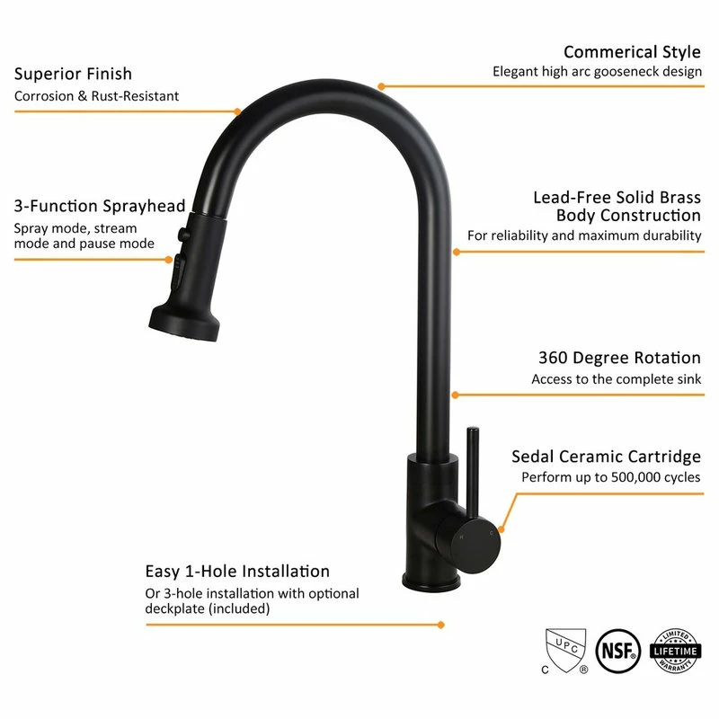 This pull down kitchen faucet meshes modern construction with excellent functionality to work efficiently in the kitchen. It features a high arc design that offers enough space for any size appliances. For enhanced flexibility, the faucet boasts a smooth-retract hose to help to target the hard-to-reach areas of the sink or fill pots. It can be swiveled 360 degrees for extra convenience. Ergonomically designed spray head allows you to easily switch among 3 functions instantly. A premium matte black finish covers the brass faucetfor a stylish, inviting look.
