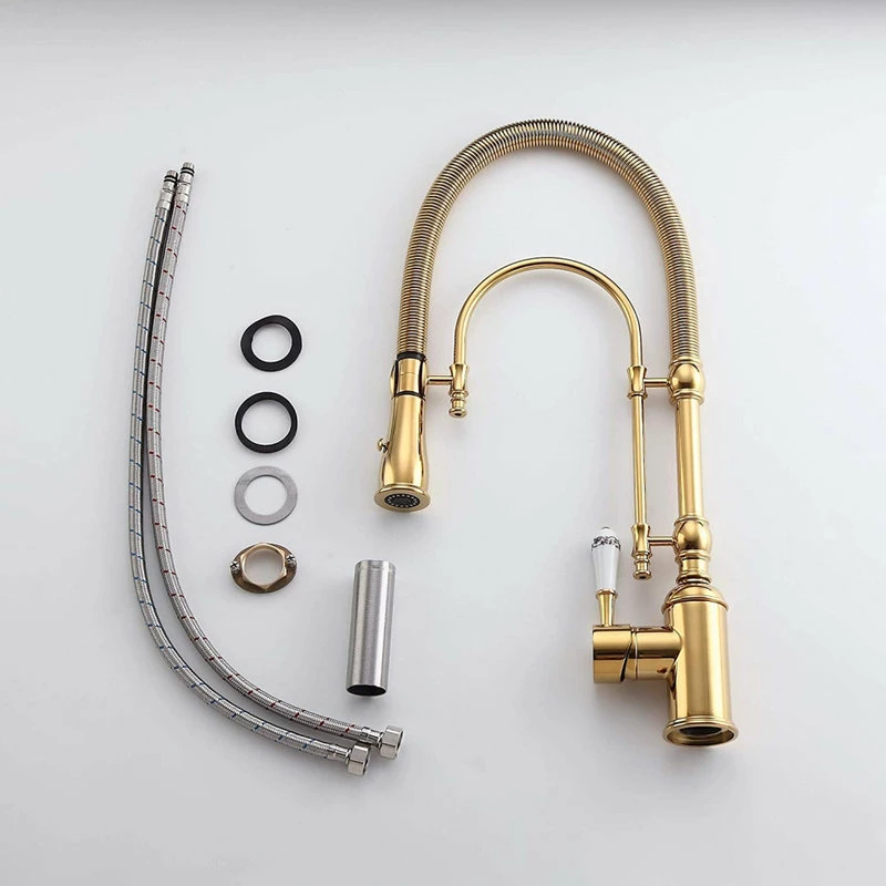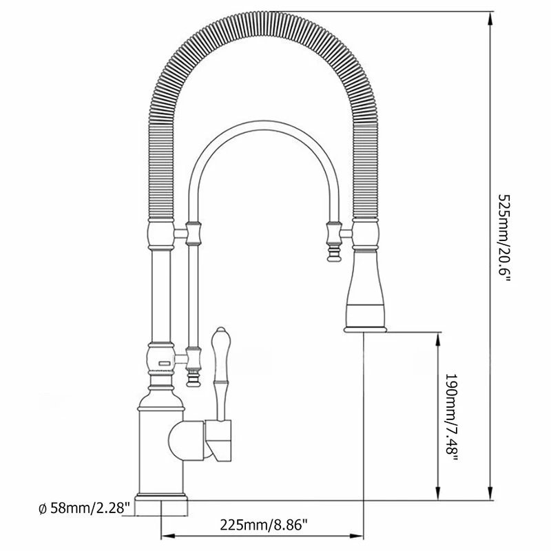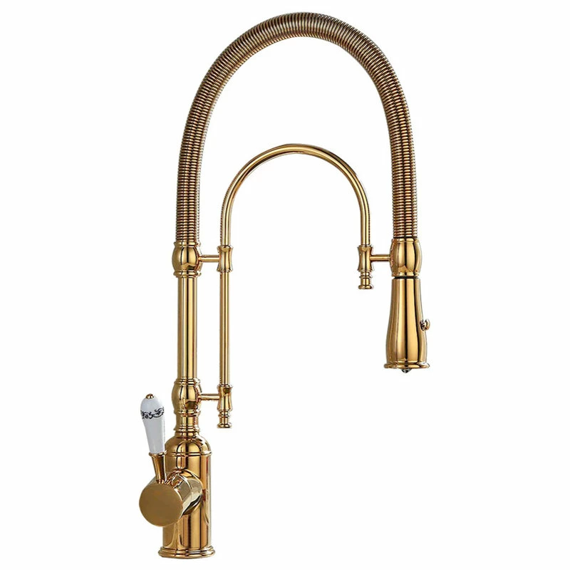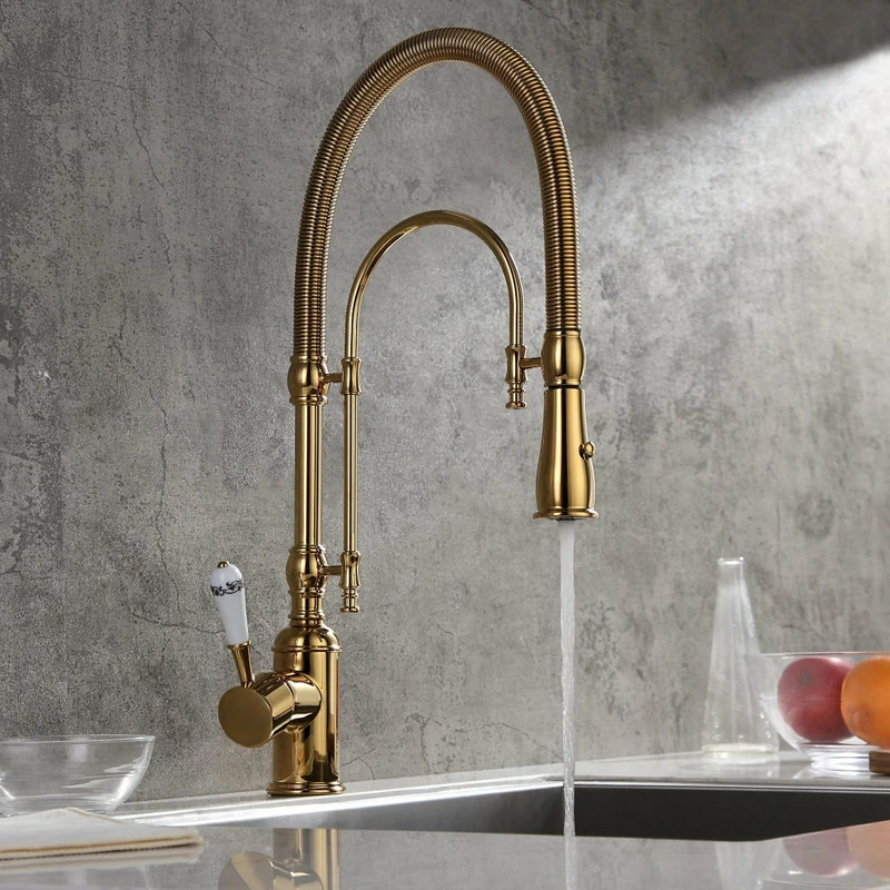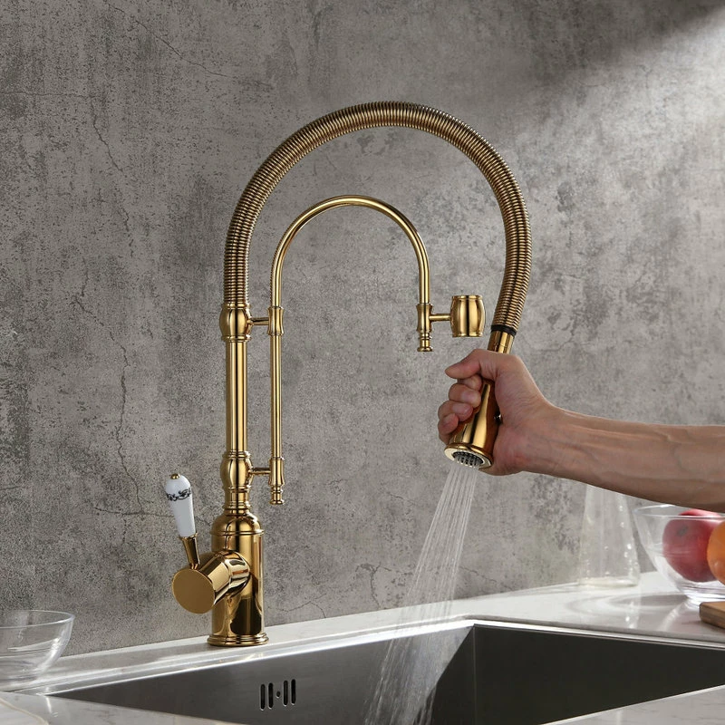 This splendid swirling dual-mode solid brass kitchen faucet with porcelain handle offers a unique blend of traditional elements and modern fluidity to complement an eclectic design with refreshed sophistication. Clean lines and a high arc spout create a sleek contemporary look. The spray head is ergonomically designed with a comfortable grip and allows you to instantly switch from stream to spray at a touch of the button. To fulfill any washing task, the spout swirls 360° to reach every corner of the sink. Worth buying!