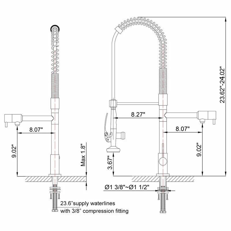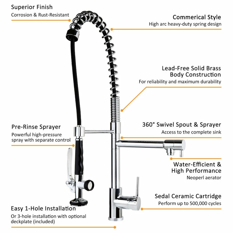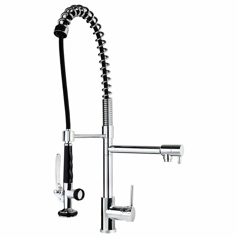 Our latest commercial kitchen faucet has an open coil spout with a sleek look perfect for the modern kitchen. With a perfect blend of utility and beauty, this versatile design will take your kitchen hardware to a new height with exceptional ergonomics and unparalleled efficiency. The 360-degree swivel design can reach every corner of the sink and provide water at easy access, while a pull-down spray and an aerated spout allow you to go from washing dishes to filling pots and pans. A clean polished chrome finish will give a cool, new look to any kitchen. Bring home this impressive and innovative kit.