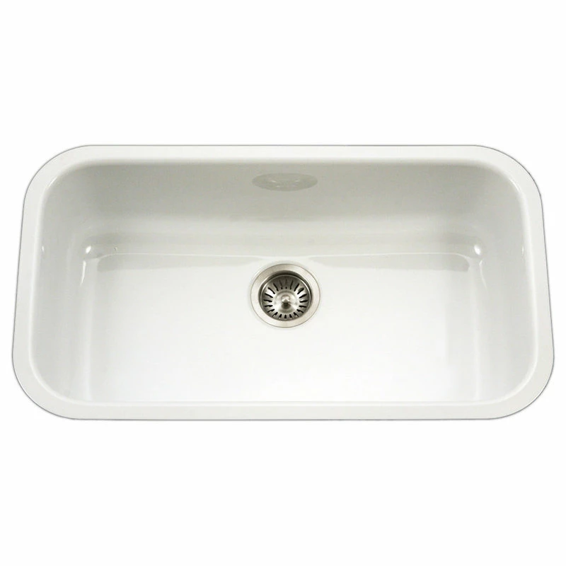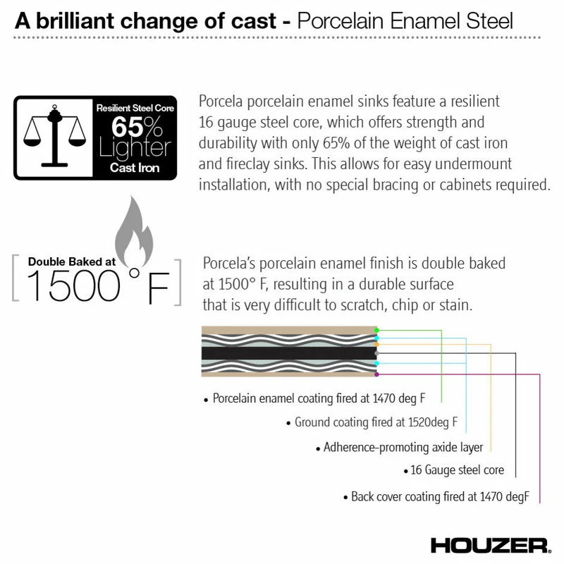 The Porcela Porcelain Enamel and Steel Undermount Kitchen Sink gives a classic shape a modern update. This 31-inch-wide sink comes in a striking white color. Double-fired porcelain enamel covers a steel base, which gives this a cast-iron look while being lighter and easier to install. This sink is resistant to chips, stains and scratches and is a smart choice for a contemporary kitchen.