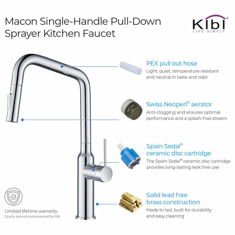 “This Macon Single-Handle Pull-Down Sprayer Kitchen Faucet with Magnetic docking. The pull-down spray wand comes free with a gentle tug and gives you total flexibility. The hose extends and retracts without friction points, fed by gravity. As you raise the wand to dock it, the magnet embedded in the spout pulls the wand precisely into place. So, unlike other pull-downs that tend to droop over time, Magnetic keeps your pull-down faucet looking picture-perfect. The well-considered