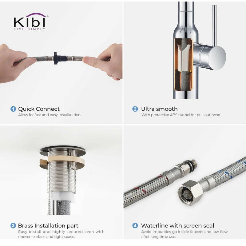 quick connection technology make the installation of the faucets very easy. The PEX pull out hose keep water inside the faucet out of contact with potential metal contaminants. These powerful combination brings you a faucet built to last up to lifetime long uses.