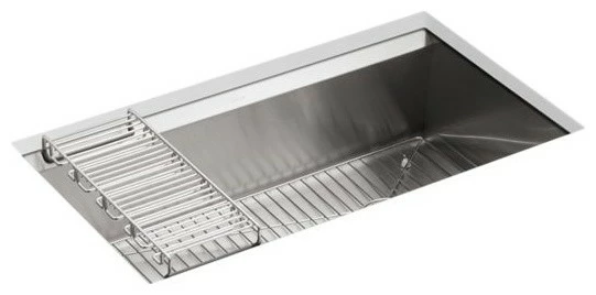The 8 Degree sink is handcrafted from thick, premium quality 16-gauge stainless steel for exceptional durability and universal style. Eight-degree angles on the front and back surfaces give you more space at the bottom of the bowl while reducing splashing. This sink includes a custom-fit wineglass rack, which allows glasses to drip dry into the basin, and a bottom sink rack to help prevent scratches.