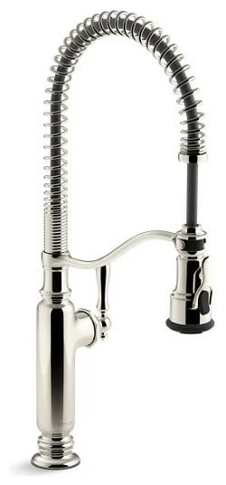 - Semiprofessional kitchen faucet with easy-clean coated hose and removable coil.