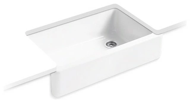 The Whitehaven apron-front kitchen sink features a streamlined and versatile farmhouse style to complement any decor. A large single basin accommodates large pots and pans, while the sloped bottom helps with draining and cleanup. Crafted from enameled cast iron, this sink resists chipping, cracking, or burning for years of beauty and reliable performance. A standard apron front makes it easy to install on 36-inch apron-front cabinetry. The Self-Trimming(R) design requires only a simple rough cut, overlapping the cabinet face for beautiful results.