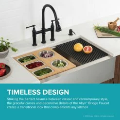 - Bridge Faucet Design: A horizontal bar connects hot and cold water handles to the faucet spout for a bold classically-inspired look