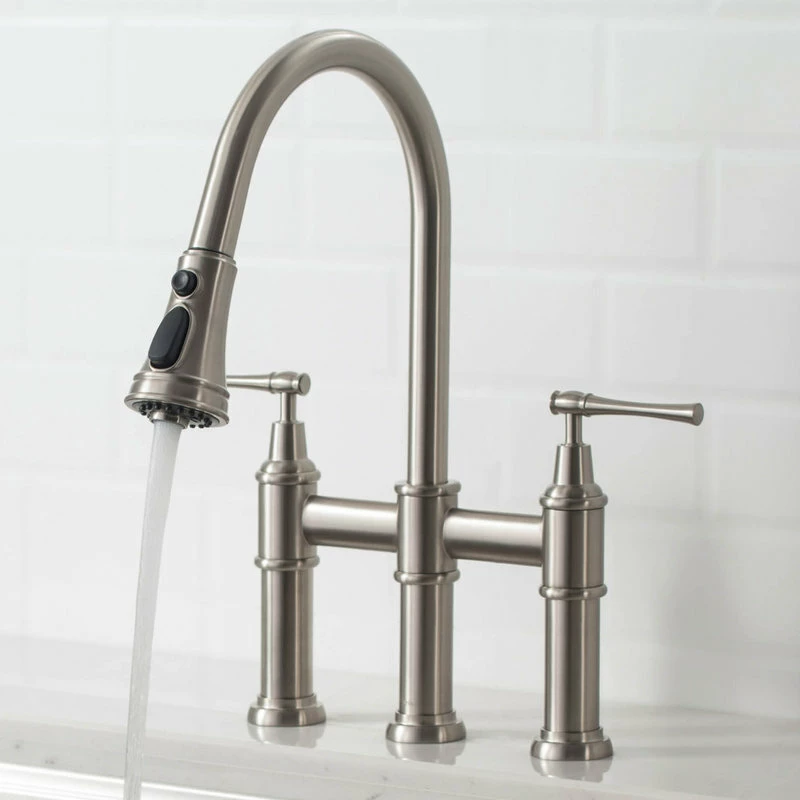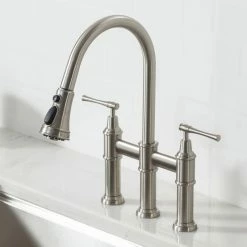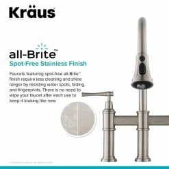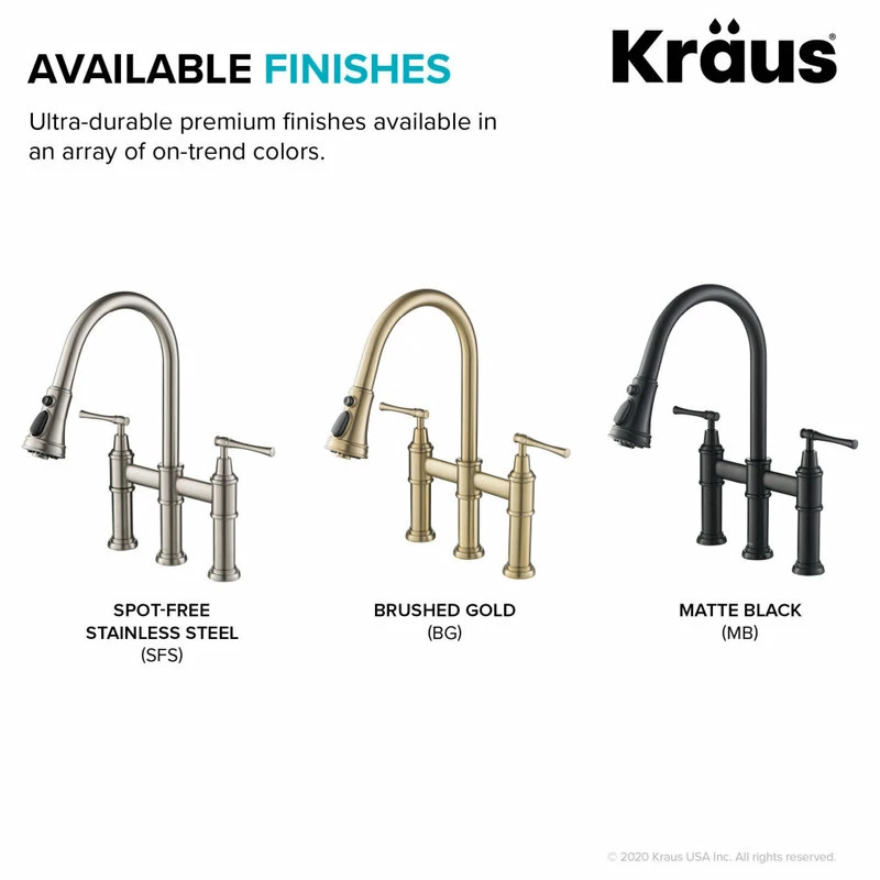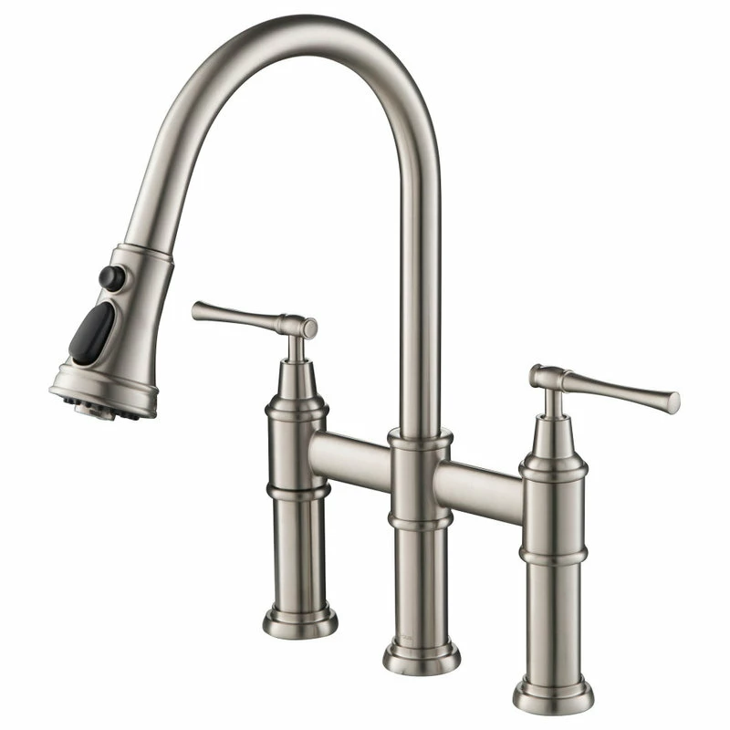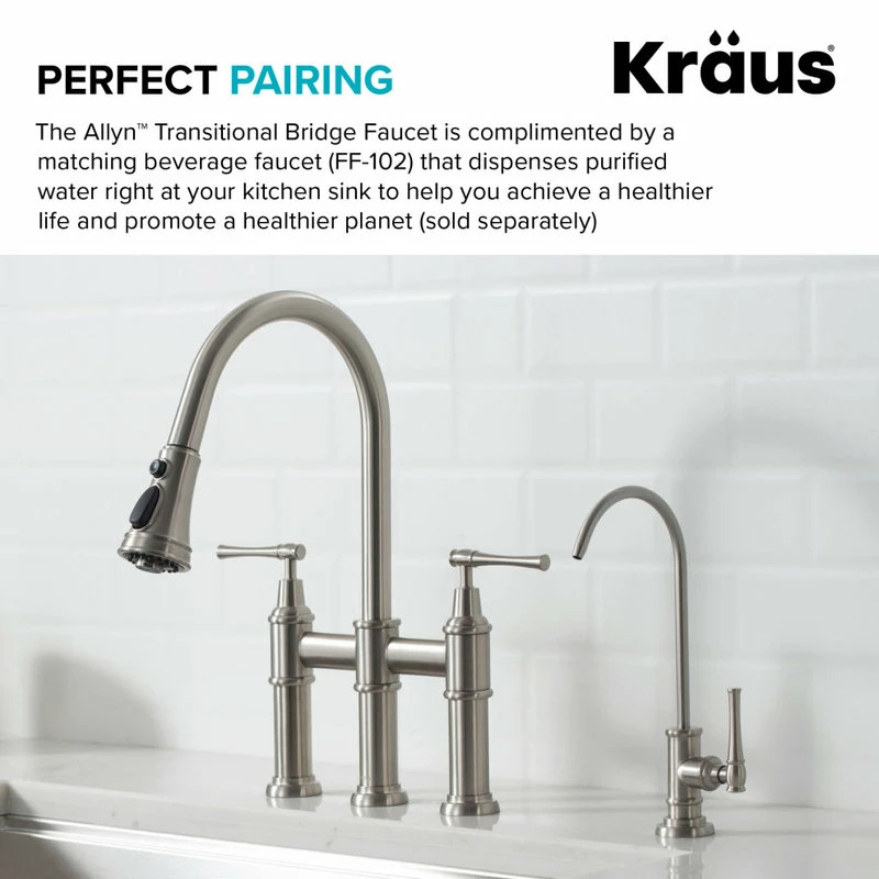 - Product: Kraus Allyn Transitional Bridge Kitchen Faucet with Pull-Down Sprayhead