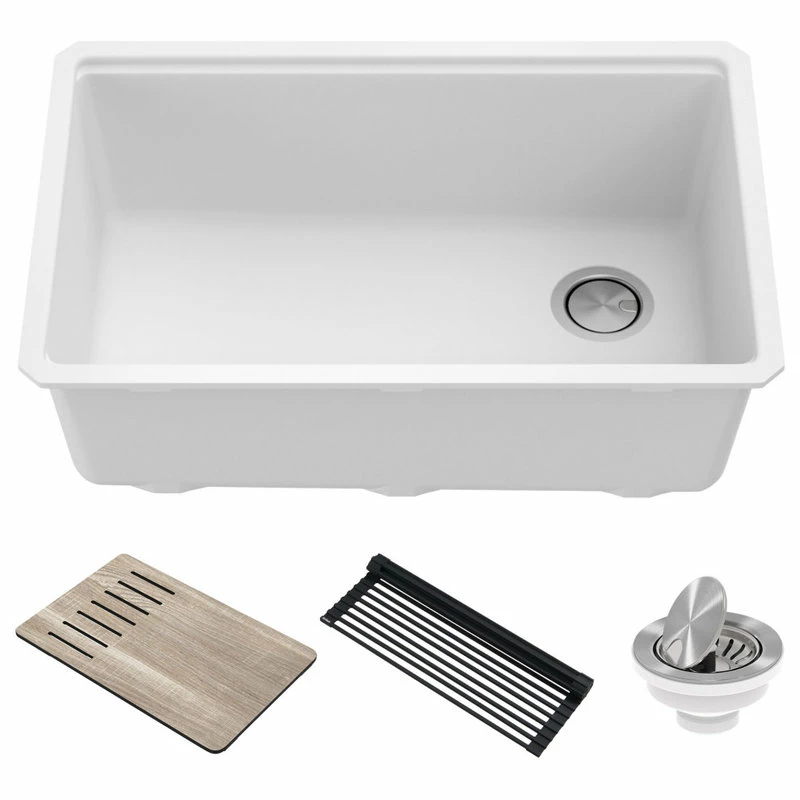 SINK KIT INCLUDES: Undermount granite composite workstation sink, heavy-duty cutting board, roll-up dish drying rack, drain assembly with strainer, mounting hardware