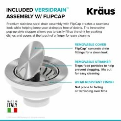 DRAIN ASSEMBLY INCLUDED: Premium stainless steel drain assembly with FlipCap creates a clean look while keeping your drainpipe free of debris, Pop-up style cover allows you to fill up the sink for soaking dishes