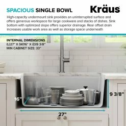 OUTER SINK DIMENSIONS: 29 in. L x 19 in. W x 10 in. D, BOWL DIMENSIONS: 27 in. L x 16 in. W x 9 3/8 in. D, Minimum Cabinet Size: 33 in.