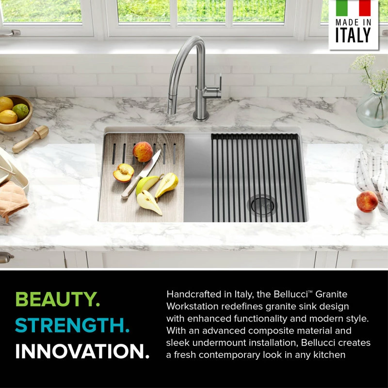 Handcrafted in Italy, the Bellucci Workstation redefines granite sinks with enhanced functionality and modern style. An integrated ledge supports custom accessories that slide across the sink, streamlining your kitchen workflow from meal-prep to clean-up. The sink comes with a chef�s kit that includes a multipurpose roll-up drying rack and heavy-duty cutting board that allow you to work right over the sink without taking up counter space. The high-performance sink is made from an advanced quartz composite material with the look and feel of real stone. Undermount installation creates a seamless transition between sink and countertop, with no exposed mounting deck to trap food and debris. The large single bowl with rear offset drain maximizes usable workspace in the sink and easily accommodates for large pots, baking sheets, and stacks of dishes. Engineered for optimal draining, the gently sloped bottom prevents water from pooling in the sink. Extra-tough construction offers unparalleled resistance to impact, heat, and thermal shock. Designed with rounded corners and a non-porous surface, this sink is stain resistant and easy to clean. The vivid fade-resistant color is enhanced with UV protection to prevent discoloration over time. Premium stainless steel drain assembly is included