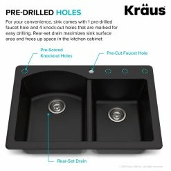 - Pre-Drilled Holes: Designed with 1 pre-drilled faucet hole and 4 knock-out holes that are marked for easy drilling