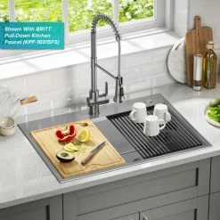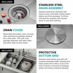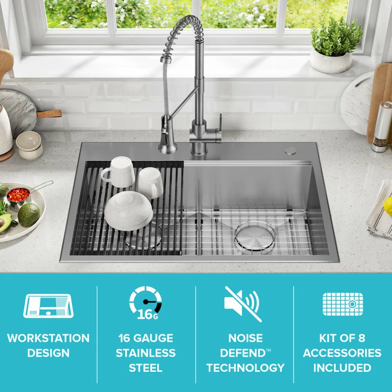Engineered with an integrated ledge to support sliding accessories, this sink creates a multifunctional workspace to streamline all your kitchen tasks. The kit includes a cutting board and roll-up dish rack that allow you to work over the sink without losing counter space. Made with KRAUS TRU16 the thickest 16-gauge stainless steel for maximum durability. Thick NoiseDefend sound dampening pads create an ultra-quiet experience. Wear-resistant finish is easy to clean and not prone to corrosion, while rounded corners on the sink bottom reduce buildup over time. Installation-ready sink comes with a protective stainless steel bottom grid and drain assembly with matching cover.