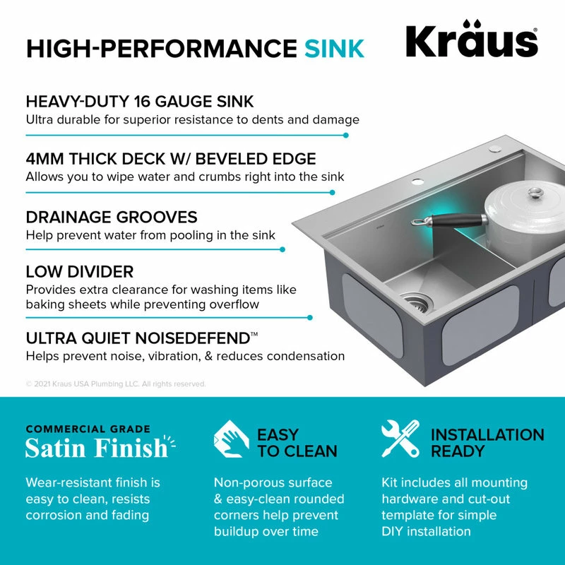 HEAVY-DUTY 16 GAUGE STEEL: Constructed from ultra-durable KRAUS TRU16, the thickest 16-gauge stainless steel for superior resistance to dents and damage