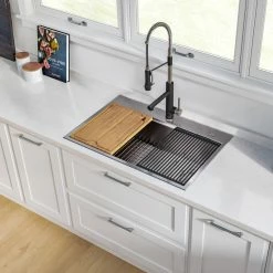 5-PIECE CHEF’S KIT: To make full use of your workstation sink the package includes a solid bamboo cutting board and a multi-purpose roll-up dish drying rack that allows you to rinse produce and drip-dry dishes right over the sink