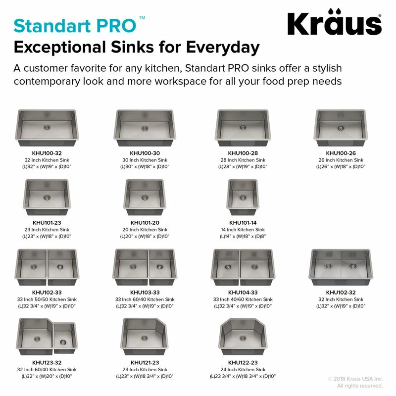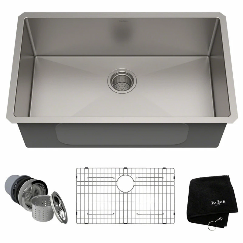 Product Features: Kitchen sink finished in stainless steel; Sink composed of stainless steel; Installation type: Undermount; Number of faucet holes: 0; Drain placement: Rear; Number of basins: 1; Basin rack included; This sink is warrantied and manufactured by Kraus; Overall Dimensions: Overall sink length: 30″; Overall sink width: 18″; Overall sink height: 10″; Basin Dimensions: Interior depth: 10″; Interior length (left to right): 28″; Interior width (front to back): 16″;