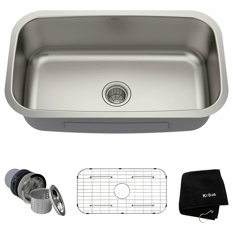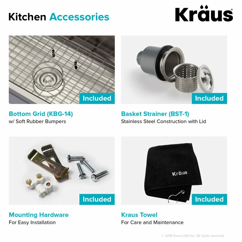 - FREE Accessories: Protective bottom grid, premium 3-piece basket strainer set, Kraus kitchen towel