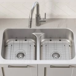 - Accessories included: Protective bottom grid with Soft Rubber Bumbers (x2), Drain assembly with strainer (x2)
