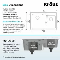 - Outer Sink Dimensions: 33 in. L x 22 in. W x 10 5/8 in. D, Min Cabinet Size: 36 in. Undermount / 36 in. Topmount