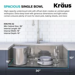 SPACIOUS SINGLE BOWL: Deep high-capacity sink with tight-radius corners and offset drain creates an uninterrupted workspace for washing your largest cookware, like stock pots and baking sheets