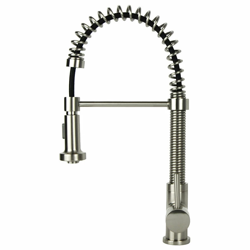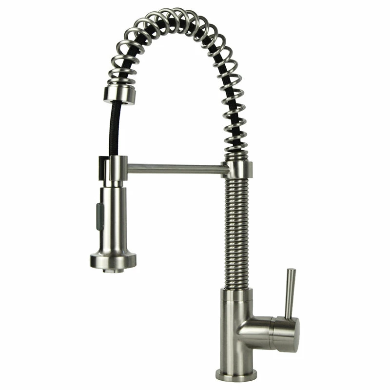 Give your kitchen a gourmet look with this residential coil spring faucet kitchen faucet. This faucet features a 2-function spray head and a coil spring neck for ease of use when cleaning large cookware.