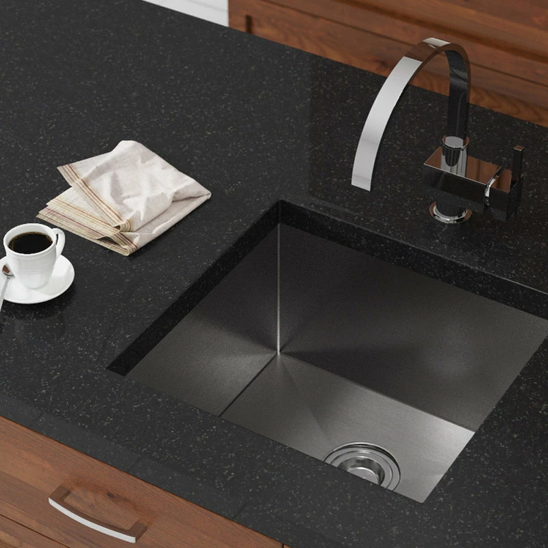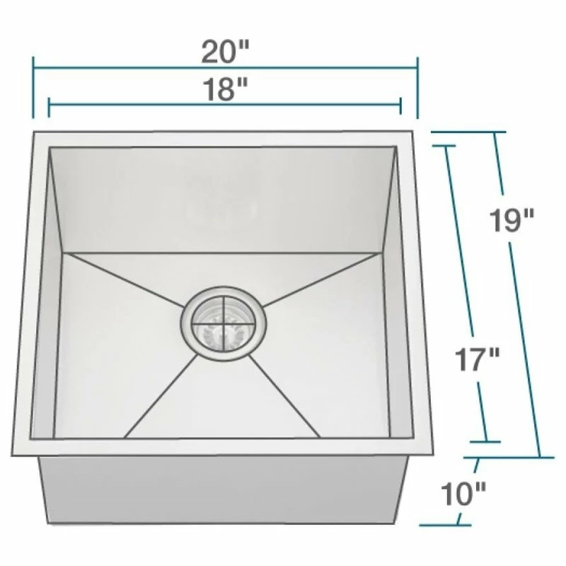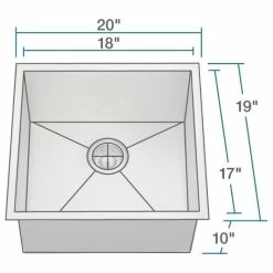 The perpendicular corners of this nearly square, stainless steel sink open up its interior space; and with its comfortable depth there is plenty of room for oversized cookware or complicated chores. This model is 304-grade, cold rolled steel, at a 16-gauge thickness; 25% thicker than the industry standard 18-gauge. The surface is given a brushed-satin finish which adds to its luster and masks minor scratches which could occur over time. Dense, sound-dampening pads and an insulation coating are applied to the underside. With an overall measurement of 20″ x 19″ x 10″, it will require a minimum-width cabinet of 21″. It is cUPC certified. This listing does not include any accessories.