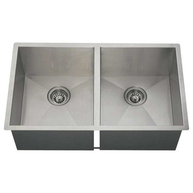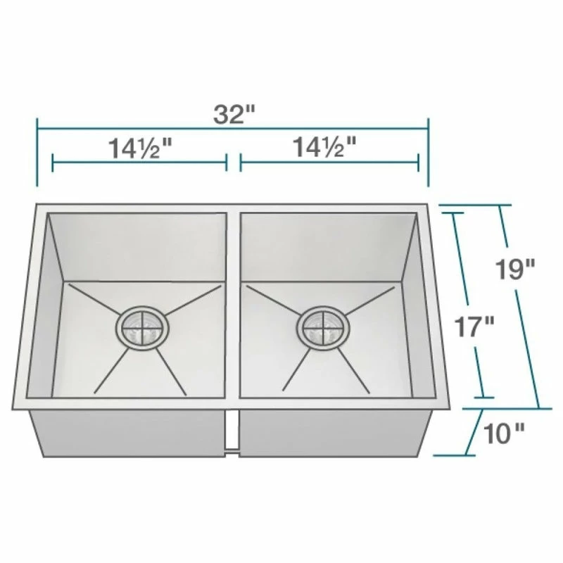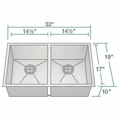 This undermount utility sink is designed with 90-degree corners which open up the sink for maximum interior space; and its two, deep equal-sized bowls allow any work to be easily divided. This model is 304-grade, cold rolled steel, at a 16-gauge thickness; 25% thicker than the industry standard 18-gauge. The surface is given a brushed-satin finish which adds to its luster and masks minor scratches which could occur over time. Dense, sound-dampening pads and an insulation coating are applied to the underside. With an overall measurement of 32″ x 19″ x 10″, it will require a minimum-width cabinet of 33″. It is cUPC certified. This listing does not include any accessories.