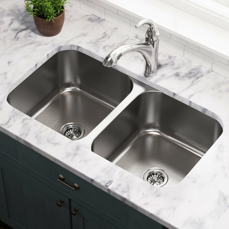 Two equal-sized bowls, over nine inches in depth, are ready for undermount installation. This model is 304-grade, cold rolled steel, at a 16-gauge thickness; 25% thicker than the industry standard 18-gauge. The surface is given a brushed-satin finish which adds to its luster and masks minor scratches which could occur over time. Dense, sound-dampening pads and an insulation coating are applied to the underside. With an overall measurement of 32 1/2″ x 18 1/4″ x 9 1/4″, it will require a minimum-width cabinet of 33″. It is cUPC certified. This listing does not include any accessories.