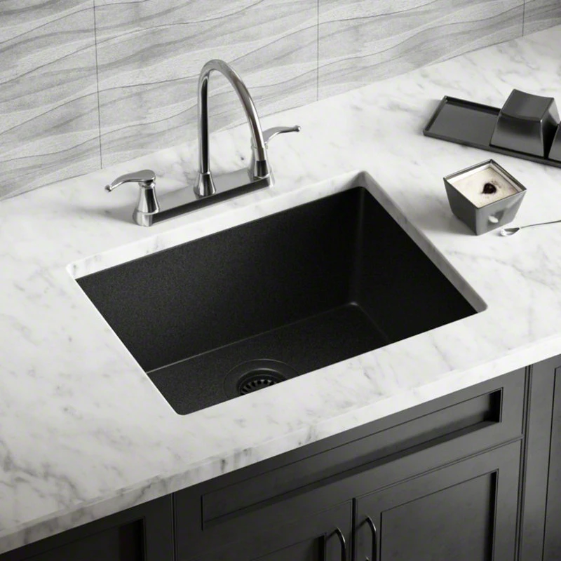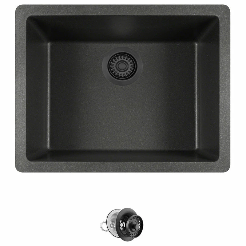 The MR Direct 808-Black Quartz Granite sink is made from a material comprised of 80% Quartz and 20% Acrylic. The 808-Black is stain and scratch-resistant and can resist heat up to 550. The smooth non-porous surface is easy to clean, leaving nowhere for bacteria to thrive. The overall dimensions of the sink are 21 5/8″ x 16 7/8″ x 7 3/4″ and a 24″ minimum cabinet size is required. The sink contains a 3 1/2″ offset drain and is available in multiple colors. As always, our Quartz Granite sinks are covered under a limited lifetime warranty for as long as you own the sink. 1 strainer, designed to match the finish of this sink, is included. It not only provides a perfect complement to the sink, but will catch unwanted waste.