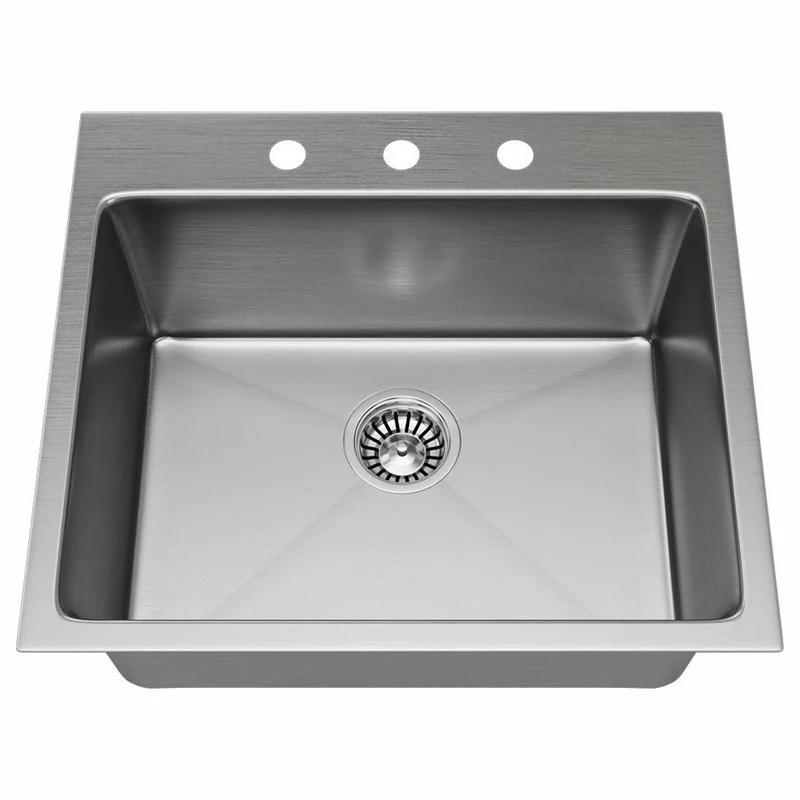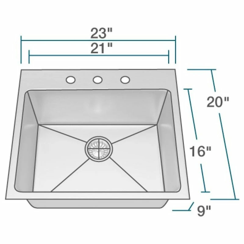 This attractive, topmount basin is not the largest single-bowl stainless steel design available; but with its 3/4″ corner-radius and 9″ depth, it provides plenty of usable sink space in restricted spaces. The T1823 is 304-grade, cold rolled steel, at the industry standard 18-gauge thickness. The surface is given a brushed-satin finish which adds to its luster and masks minor scratches which could occur over time. Dense, sound-dampening pads and an insulation coating are applied to the underside. With an overall measurement of 23″ x 20″ x 9″, it will require a minimum-width cabinet of 24″. It is cUPC certified. This listing does not include any accessories.