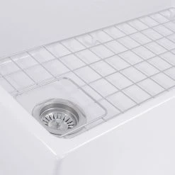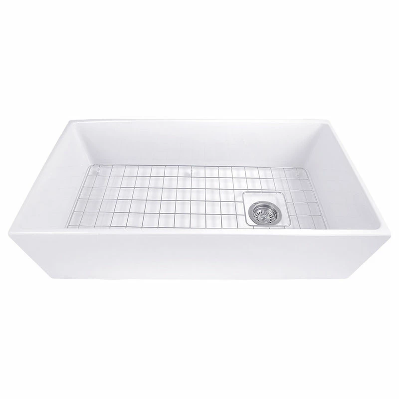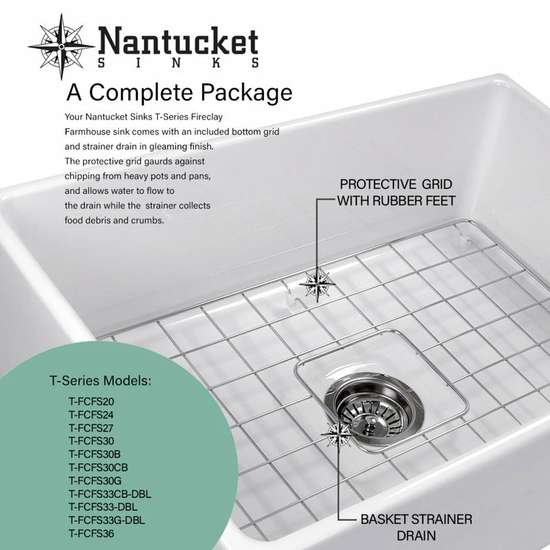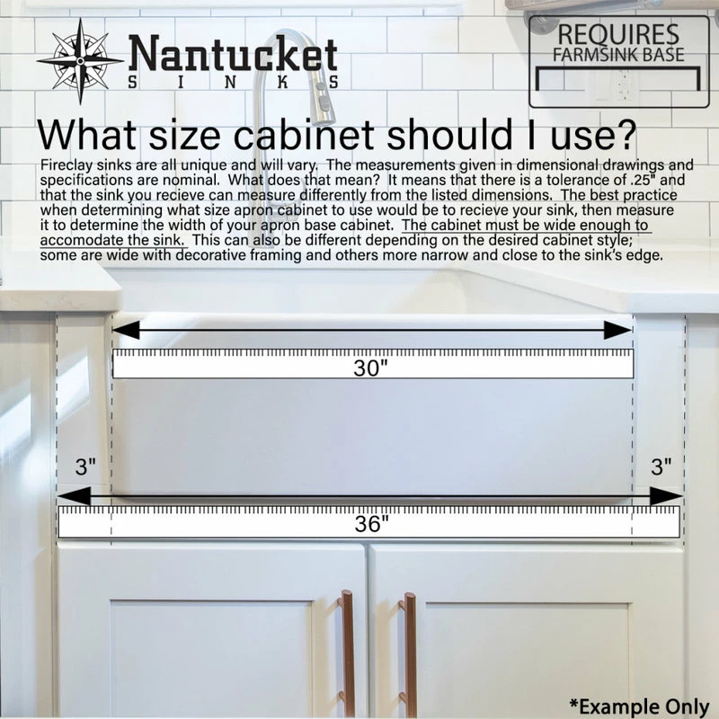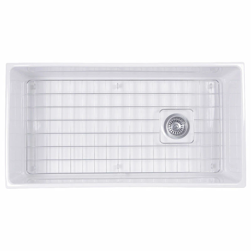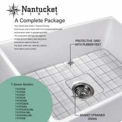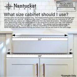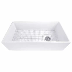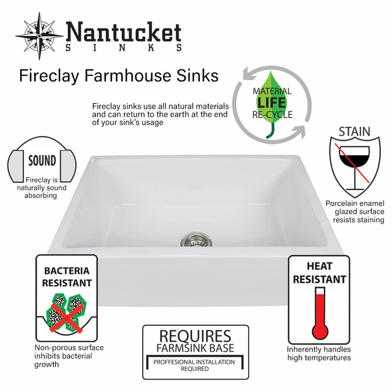 Nantucket Sinks T-FCFS36 – 36″ white farmhouse fireclay sink includes bottom grid & drain. Features an offset drain. This sink is reversible so the drain can be placed on the side of your preference. Elegant lines and wide basin are just the right touch for a full-capacity kitchen! Sides of sink have a slight 1/4″ taper from top to bottom. There are many benefits to fireclay. Its glazed surface inhibits bacterial growth more than stainless steel. It is eco-friendly requiring less cleansers. Apron Height is 10 inches. Due to the firing process, dimensions are nominal and may vary to actual up to .25″. Custom cabinet required to support weight of this sink. * A note about fireclay: small cracks will appear on the unglazed underside of the sink, these are cosmetic only and have no impact on the performance of the sink.