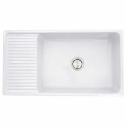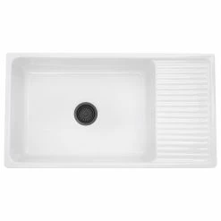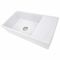 Discover the benefits of a built-in drainboard with Nantucket Sinks FCFS36-DB fireclay model. A classic farmhouse apron sink design, the drainboard has many benefits: space saving, eco-friendly and convenient. The drainboard contains the water and channels it back to the drain. When you want to quickly handwash items, no more searching for a spot on the counter or pulling out an unsightly rack for drying. Features a decorative lip on both sides and all sides are glazed so the sink is reversible. Its glazed surface inhibits bacterial growth more than stainless steel. Due to the firing process, dimensions are nominal and may vary to actual up to .25″. Farmhouse apron cabinet required. – A note about fireclay sinks: due to the curing process, small surface cracks typically appear on the underside of the sink. These cosmetic flaws are from the molding process and do not affect the performance or visible luster of the sink.