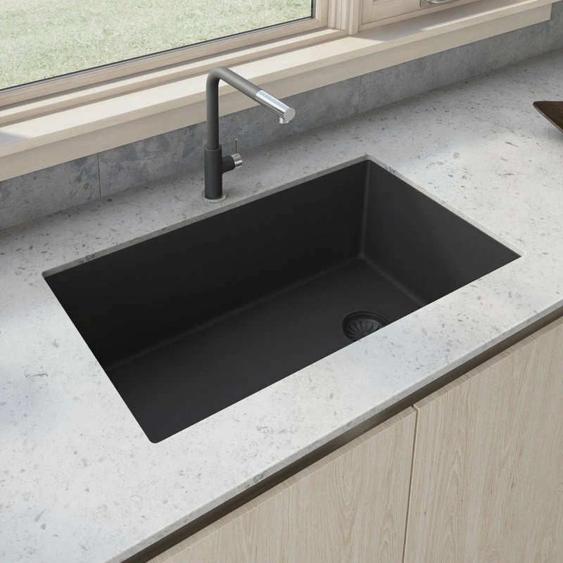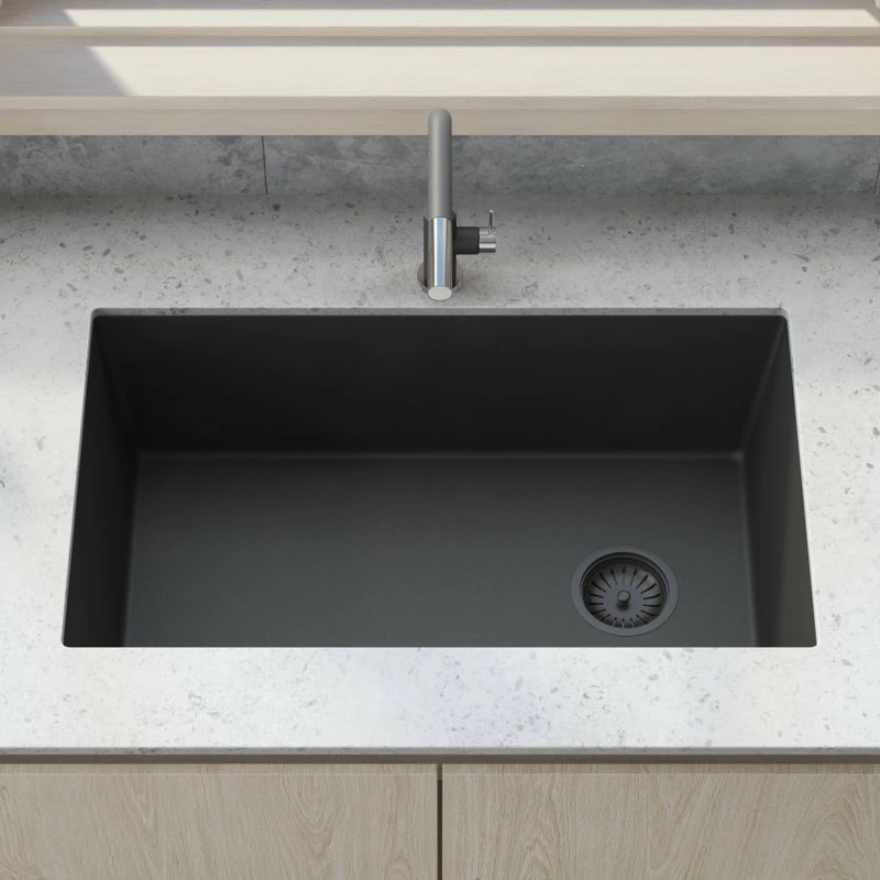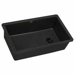 The epiGranite series of kitchen sinks from Ruvati sets a new trend for the home kitchen. If you are looking beyond stainless steel, and want to add some color and character to your kitchen design, the epiGranite sinks are an elegant choice. The sink is constructed from 80% crushed natural granite, giving the sink extreme durability and the look of real stone. The sink is colored all the way through, for a rich and consistent look that will never discolor. The surface of the sink undergoes a proprietary treatment making it resistant to stains, bacteria and extreme temperatures up to 536 degrees Fahrenheit. The sink comes with a basket strainer drain assembly that traps food waste and is easy to empty into the trash. Ruvati epiGranite sink comes in 8 different color options ranging from warm Caribbean Sand to elegant Black Galaxy. Now you can have a kitchen that truly reflects your style and personality.