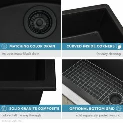 Constructed of composite granite – 80% crushed natural granite for extreme durability and strength. The remaining 20% is a proprietary resin that makes the sink completely non-porous and resistant to most household chemicals.