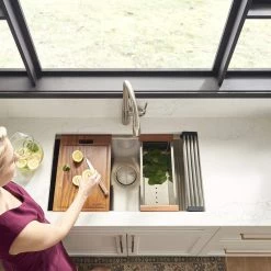 Convert your kitchen sink into a fully functional workstation with the Roma collection from Ruvati. Featuring an undermount installation and sharp inside corners, modernity is apparent. The workstation design features a built-in ledge that provides a platform for Ruvati’s unique accessories. Each sink in the Roma collection features a solid hardwood cutting board and decorative drain cover. Some also include a stainless steel colander or Ruvati’s patented foldable drying rack. With the Roma collection, you can do all your prep work on top of your sink and keep your countertops free of mess.