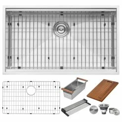 INCLUDED IN BOX: sink, stainless steel colander, solid wood cutting board, dish drying foldable rack, stainless steel bottom rinse grid, basket strainer drain assembly, decorative drain cover, cut-out template, and mounting brackets.