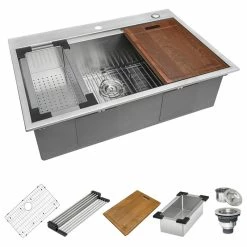 Convert your kitchen sink into a fully functional workstation with the Roma collection from Ruvati. Featuring an undermount installation and sharp inside corners, modernity is apparent. The workstation design features a built-in ledge that provides a platform for Ruvati’s unique accessories. Each sink in the Roma collection features a solid hardwood cutting board and decorative drain cover. Some also include a stainless steel colander or Ruvati’s patented foldable drying rack. With the Roma collection, you can do all your prep work on top of your sink and keep your countertops free of mess.