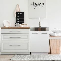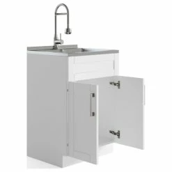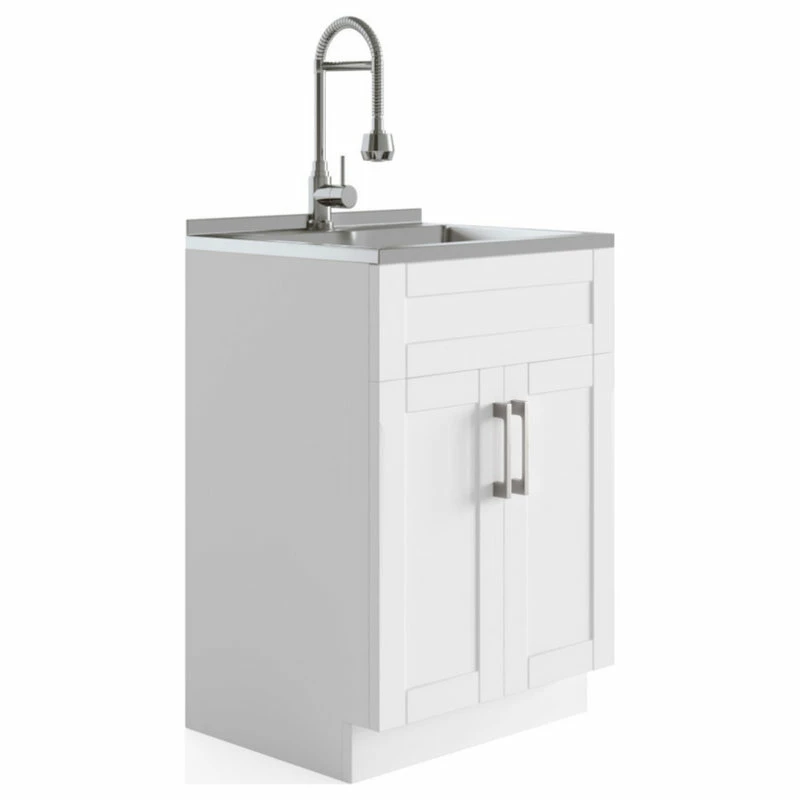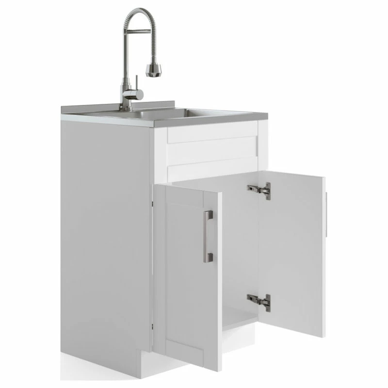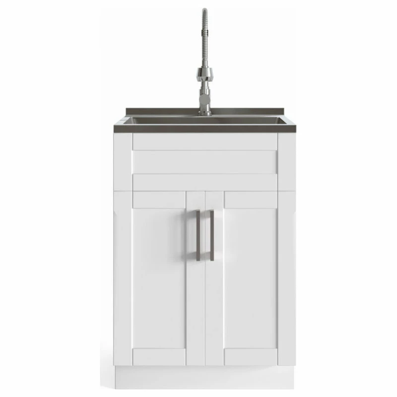 Simple clean lines define the Kyle Laundry Cabinet. With shaker style doors, single lever pull out faucet and sleek brushed nickel door pull, the Kyle laundry cabinet brings both functionality and stylish design to your laundry room.