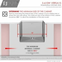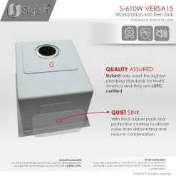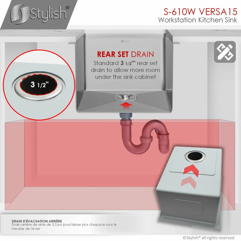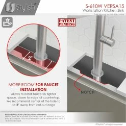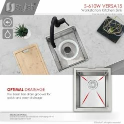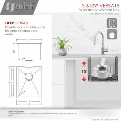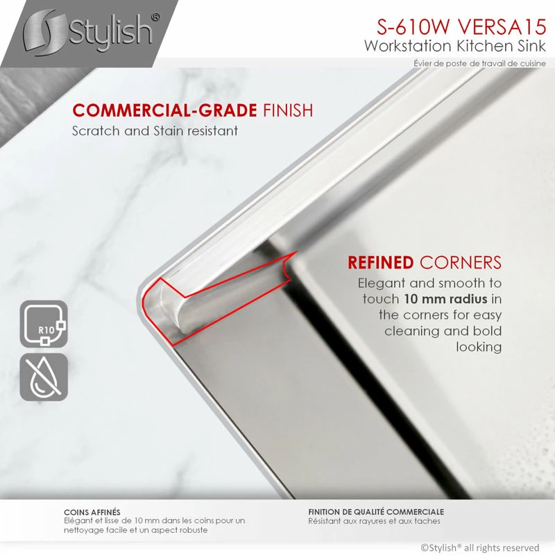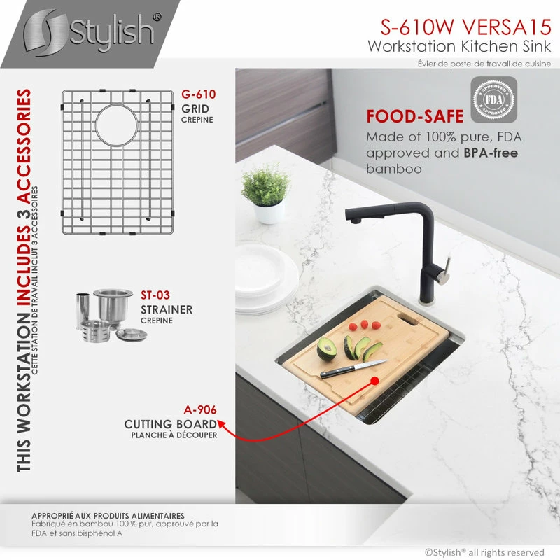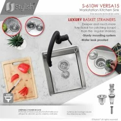 Adding style and functionality to your kitchen has never been easier with the amazing Versa15 kitchen sink workstation which includes one 15โx19โ single bowl undermount stainless steel kitchen sink, one protective stainless steel bottom grid, one perfect fit bamboo cutting board. This workstation sink comes with the ledge on the longer sides of the sink. This ledge allows the kitchen sink accessories to perfectly fit making it a unique and functional experience. The undermount stainless steel kitchen sink features a rear set drain that truly allows maximum space under the kitchen cabinet. The Sink bottom is designed with small slope and grooves for efficient water drainage. Another great reason to have this workstation installed is the undermount soundproofing, sink is covered with thick pads on all sides, it is guaranteed to be silent while in use, additionally there is an undermount coating that will protect your kitchen cabinet from condensation. Made from premium material, the Versa15 workstation is handcrafted using super thick 16 gage and premium 304 stainless steel with 18/10 chrome/nickel content and featuring a commercial-grade satin finish to hide marks and scratches and unlike most competitors this sink features gently rounded corners all around to make cleaning as simple as wiping the surface with a damp cloth. This workstation would not be completed without our luxury basket strainer. Also included, the basket strainer is larger and more efficient than regular strainers as it catches food scraps and debris to prevent the drain from getting clogged. For easy installation, all mounting hardware and installation instructions are provided.โฏ Our stylish and functional single bowl undermount kitchen sink workstation is what your kitchen is missing.