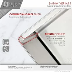 All welds and corners are perfectly blended through an automated machine buffing system and carefully hand polished for a luxurious finish. This undermount single bowl kitchen sink workstation has elegant and smooth to touch 10mm radius in the corners for a bold look and at the same time add functionality allowing to clean the kitchen sink very easily.