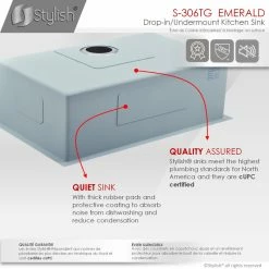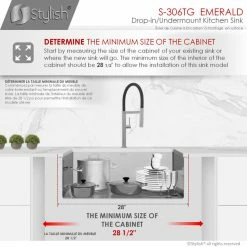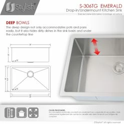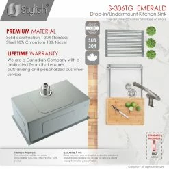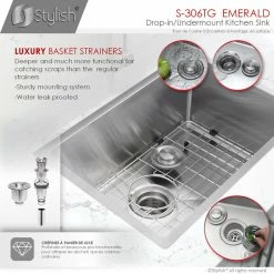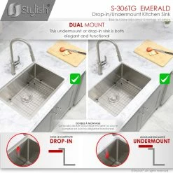 Create a sophisticated kitchen look with our Styluxe Sink Series. Featuring this 28″ x 18″ undermount Kitchen Sink. This stainless steel kitchen sink includes one luxury basket strainer and one bottom grid made of 100% stainless steel which will really help to protect your sink from dents or scratches. Handcrafted using premium 304 stainless steel with 18 gauge and 18/10 chrome/nickel content and featuring a refined brushed finished. This undermount kitchen sink has the drain towards the rear, for better utilization of the space under the sink cabinet. Also, the stainless steel kitchen sink basin has drain grooves for optimal drainage. This handmade stainless steel sink combines functionality, quality, and affordability. The tight 10mm radius corners are perfectly blended through an automated machine buffing system, and careful hand polished, for a luxurious finish. This undermount kitchen sink is equipped with top-level soundproofing, including thick rubber dampening pads. Each sink is additionally treated with protective coating, which reduces condensation and further dampens sound. The corrosion-resistant surface is further protected from rust and oxidation by a meticulous finishing process. Commercial-grade satin finish and gently rounded corners make maintenance as simple as wiping the surface with a damp cloth. For easy installation, all mounting hardware is provided. Our sinks are Canadian designed and meet the highest plumbing standards of North America. Stylish sinks are trusted by architects and builders for upscale projects and modern makeovers.