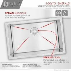 - OPTIMAL DRAINAGE: Drain grooves in the bottom of the sink’s basin add a stylish look and prevent pooling as water is directed towards the drain openings. This single undermount kitchen sink has a standard 3.5” rear drain opening that is engineered for quick and easy drainage and for better utilization of space.