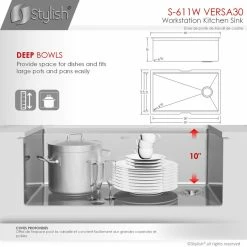 All Stylish sinks are equipped with soundproofing system including a protective coating and extra thick rubber pads to create a noticeable lower tone and overall a very quiet sink. This coat is sprayed underneath the sink to prevent water condensation. For added functionality, Stylish workstations sinks come with luxury basket drain strainers, which are deeper and much more functional for catching food scraps than the regular strainers. Stylish® sinks are Canadian designed and meet the highest plumbing standards for North America. The undermount stainless steel kitchen sink features not only a sided set drain, but the drain is also set to the middle, this is a brilliant feature that truly allows maximum space under the kitchen cabinet and you can install the drain to the left or to the right. Also sink basins have drain grooves for optimal drainage.